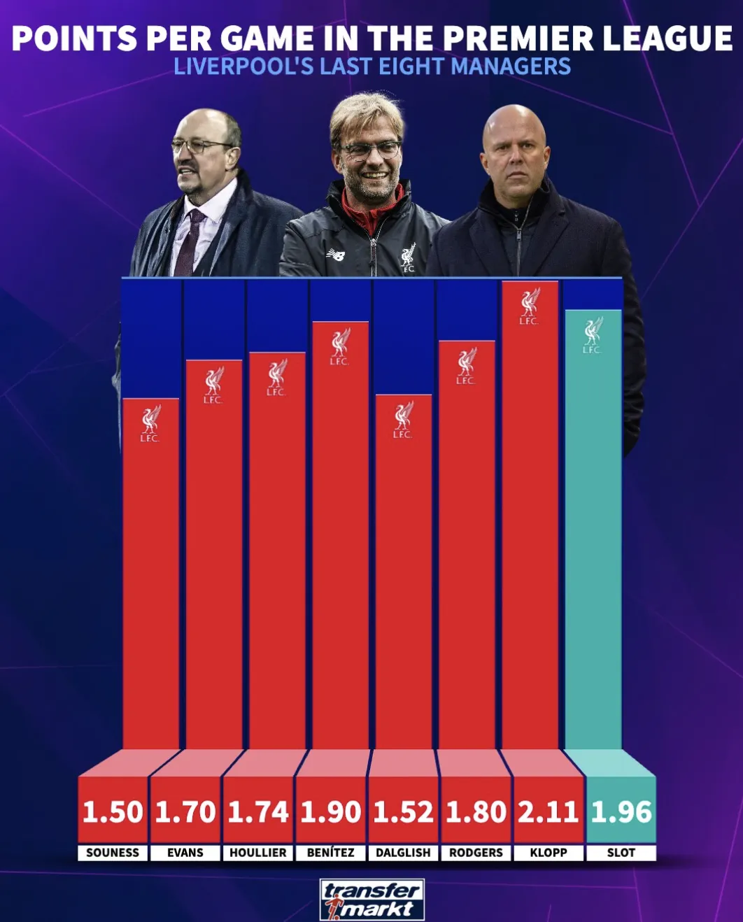 克洛普以场均得2.11分居首;斯洛特以1.96分排名第二;贝尼特斯以1.9分排名第三: